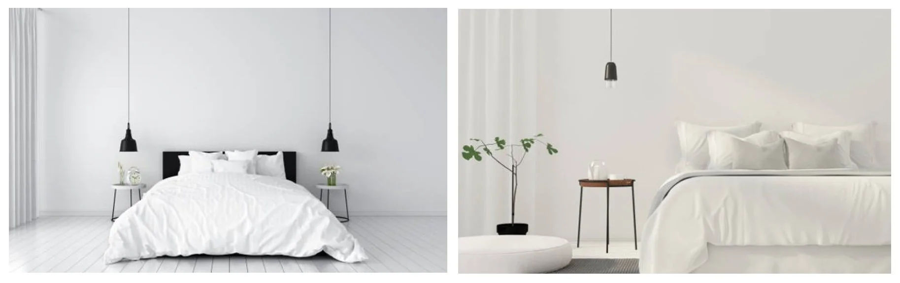 Bedside Table lamps, wall scones and hanging pendants produce warm, flattering lights making the space cozy and appealing. Classic yellow string lights around the curtains and bed post look incredibly romantic when paired with monochromatic bedroom.