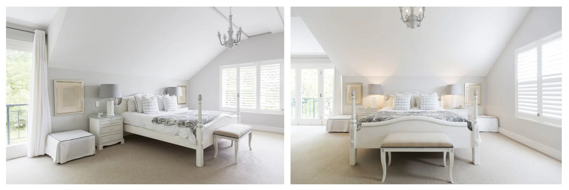 Use Period furniture to add character in a white bedroom; from contemporary pieces to mid-century modern classics, vintage items, and antiques. A mid-century rocking chair, a contemporary white pendant light, and vintage painted metal bar stools to name a few that give your room a timeless, enduring, and dimensional look.